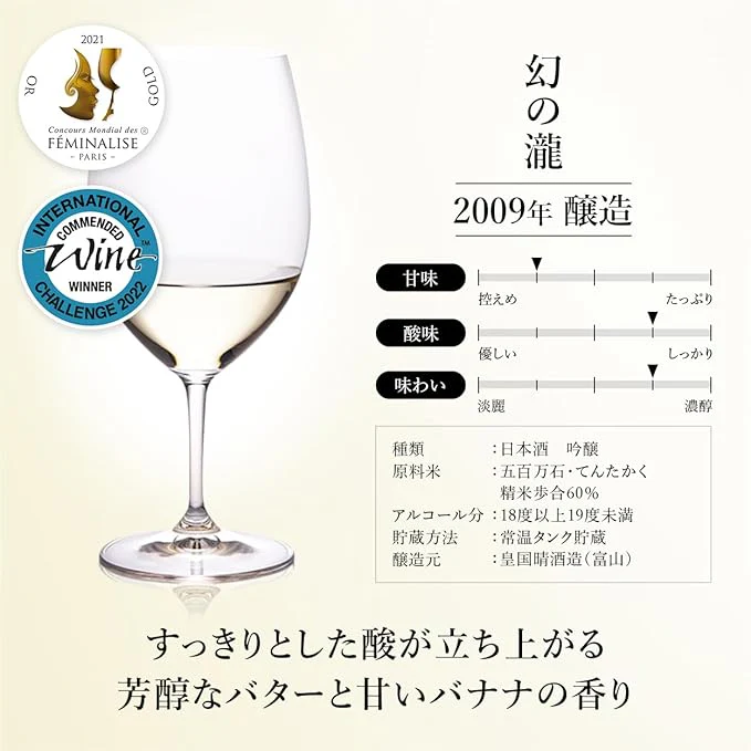Aged ginjo sake. Its characteristic is that it first releases a clean acidity, and you can also sense the rich aroma of butter and the sweet aroma of banana, making it very elegant, as if you were drinking a dry white wine. The lingering aroma of nuts is impressive.